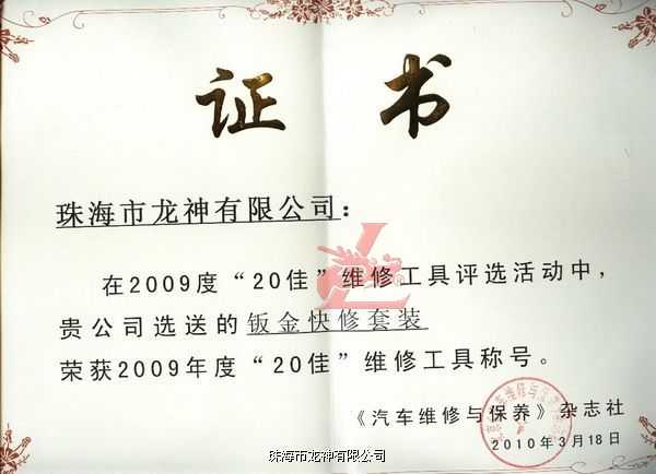 2010年北京汽保春季展期間,由中國汽車保修設備行業(yè)協(xié)會和《汽車維修與保養(yǎng)》雜志共同舉辦的2009年度“20佳”維修工具頒獎典禮,于2010年3月18日在北京江河水鳥巢麗景隆重舉行,龍神“鈑金快修套裝”在眾多候選產(chǎn)品中脫穎而出,獲得本屆評審委員會專業(yè)評委的一致認可:符合產(chǎn)品創(chuàng)新性、實用性、效率性,可幫助企業(yè)提高工作效率,授予“中國汽車維修市場2009年度20佳”榮譽稱號。